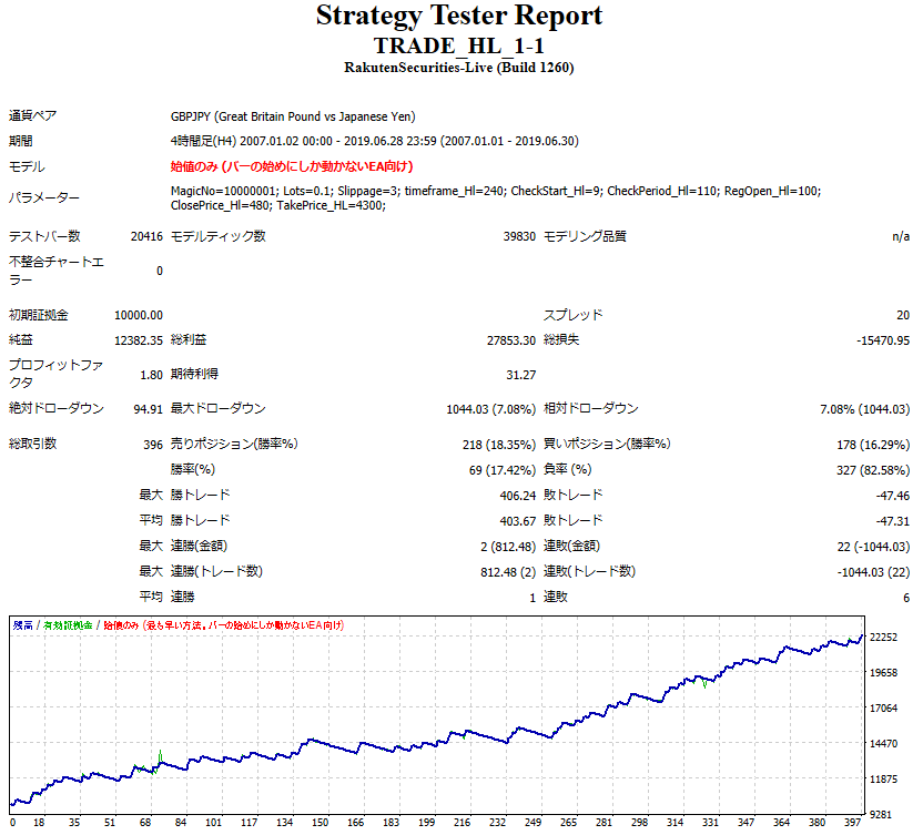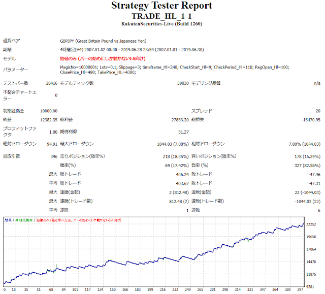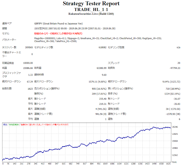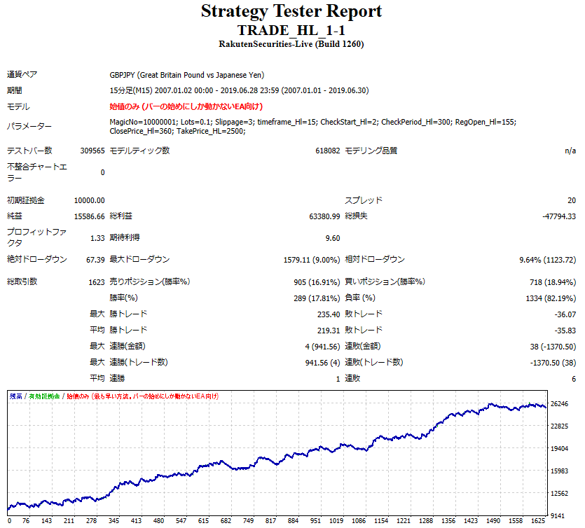 以下、通貨はGBPJPYで、15分足でバックテストした結果です。