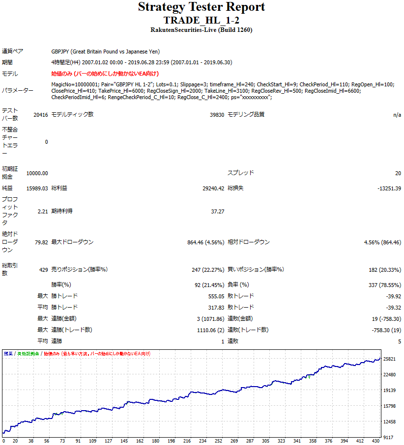 以下、通貨はGBPJPYでバックテストした結果です。